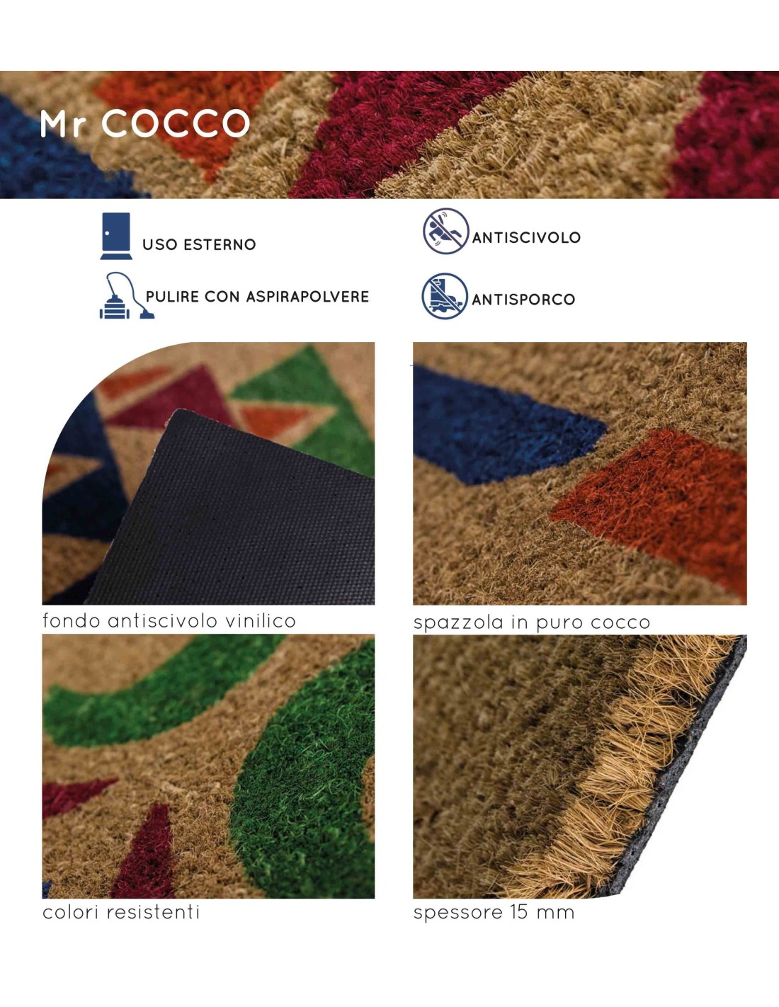Tapis d’entrée créé par une épaisse brosse à noix de coco naturelle d’environ 15 mm de haut et complétée par une base antidérapante en vinyle décorée de couleurs spéciales résistantes à la lumière et à l’eau..