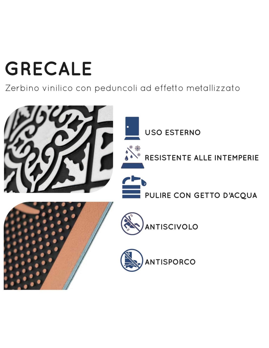Grecale un tapis éco-responsables 100% PVC recyclé, créé par d’innombrables pédoncules pour brosser vos chaussures, agrémentée d’une décoration en relief de couleurs métalliques et brillantes dans les tons d’argent et de bronze..