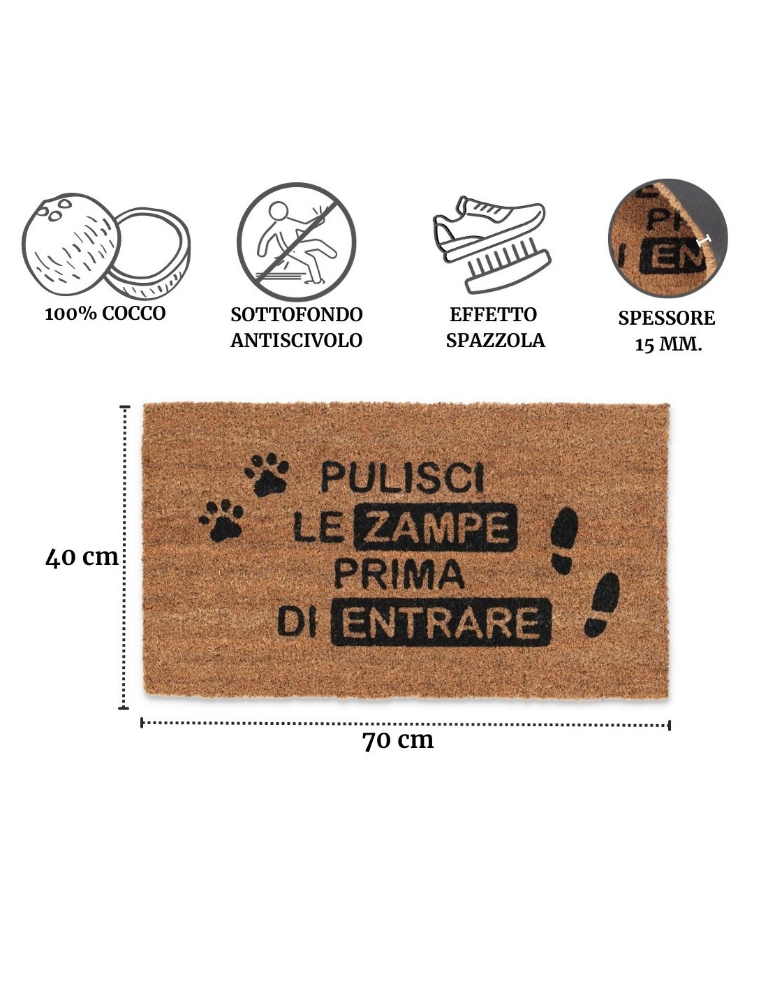 CARACTÉRISTIQUES: paillasson imprimé 100% noix de coco avec fond en PVC d’environ 15 mm de haut..