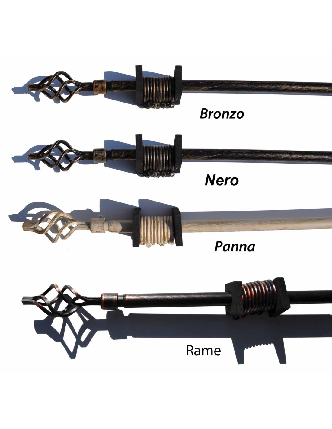 FONCTIONNALITÉS: Tringle à rideau métallique extensible d’un diamètre de 1,8 cm. et une finition torsadée de 13 cm. Offert en 2 longueurs et de nombreuses couleurs, pas uniforme comme rayé par le temps avec une touche de vieilli à l’exception du chrome qui a un effet brillant et lumineux..