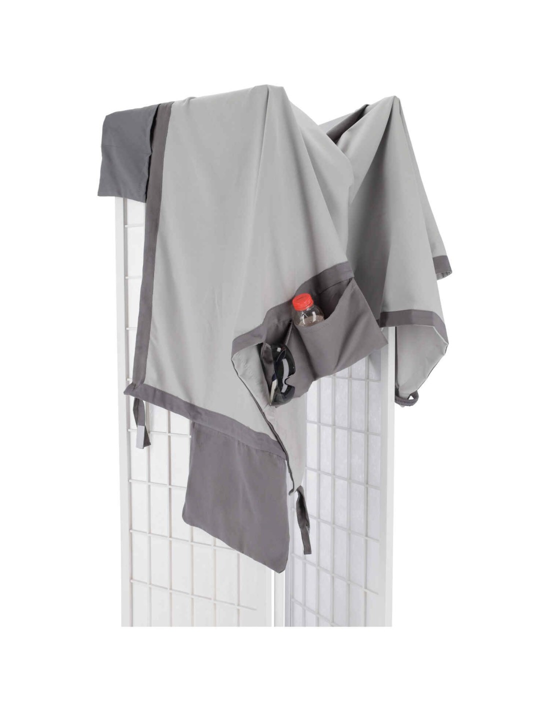 Il est équipé de bandes élastiques et de sangles avec velcro sur les quatre côtés à fixer à la chaise longue et de 2 poches latérales pour ranger vos objets et les avoir toujours à portée de main..