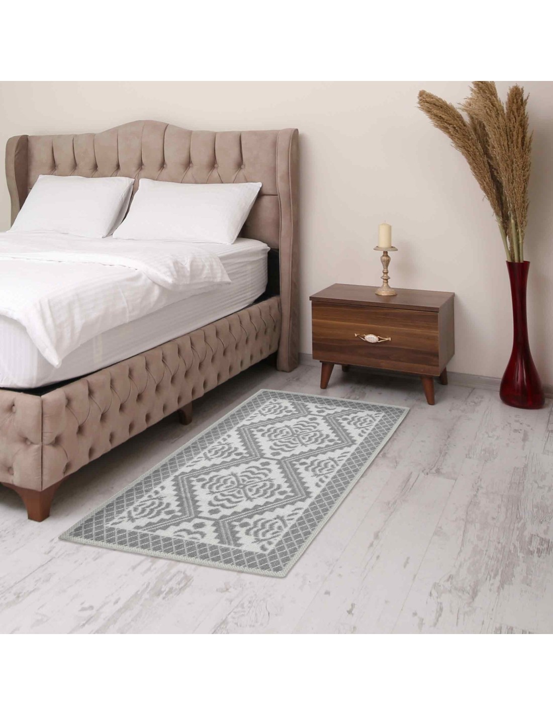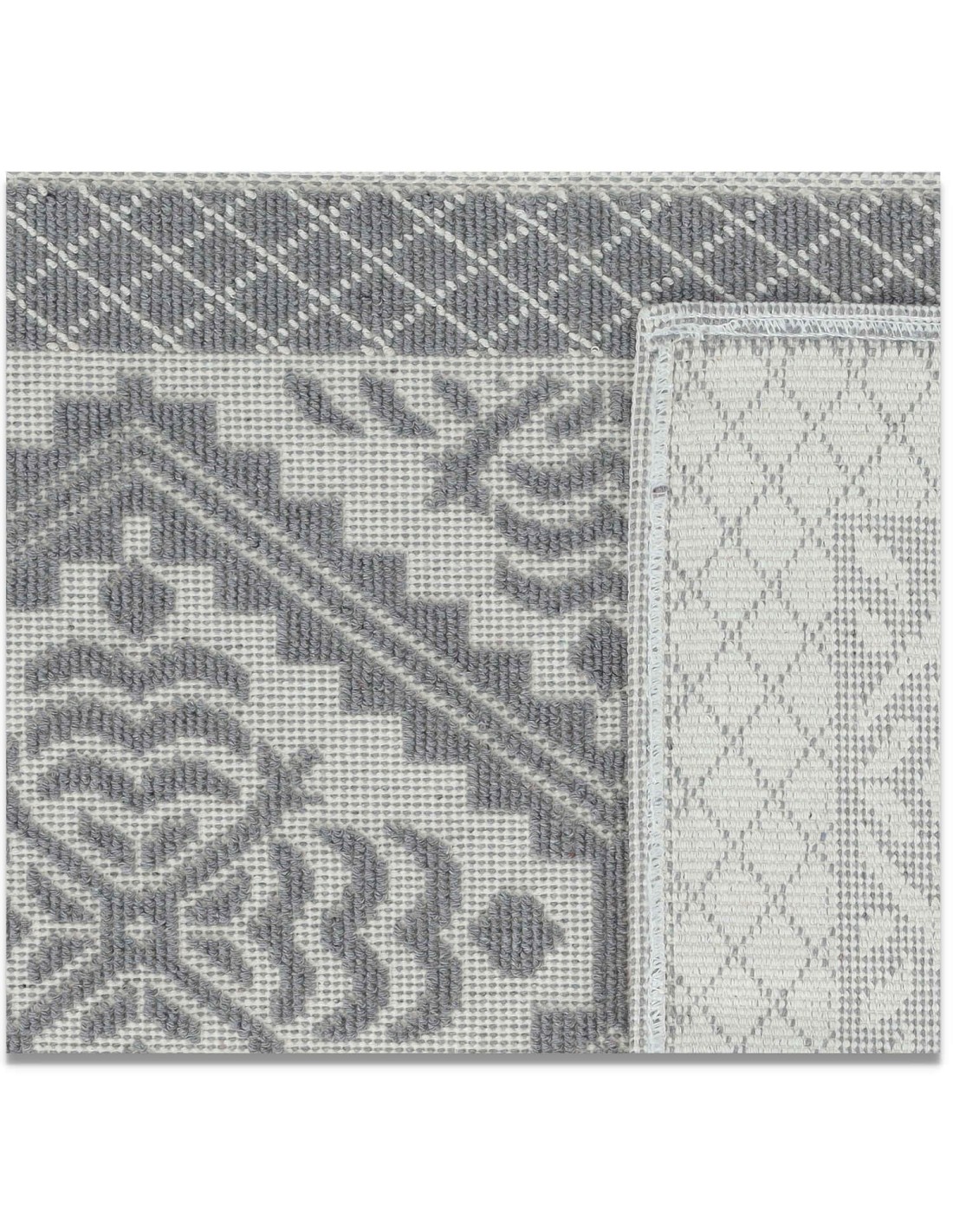 E' un tappeto in misto cotone, rifinito con ripiego cucito e angoli quadrati..