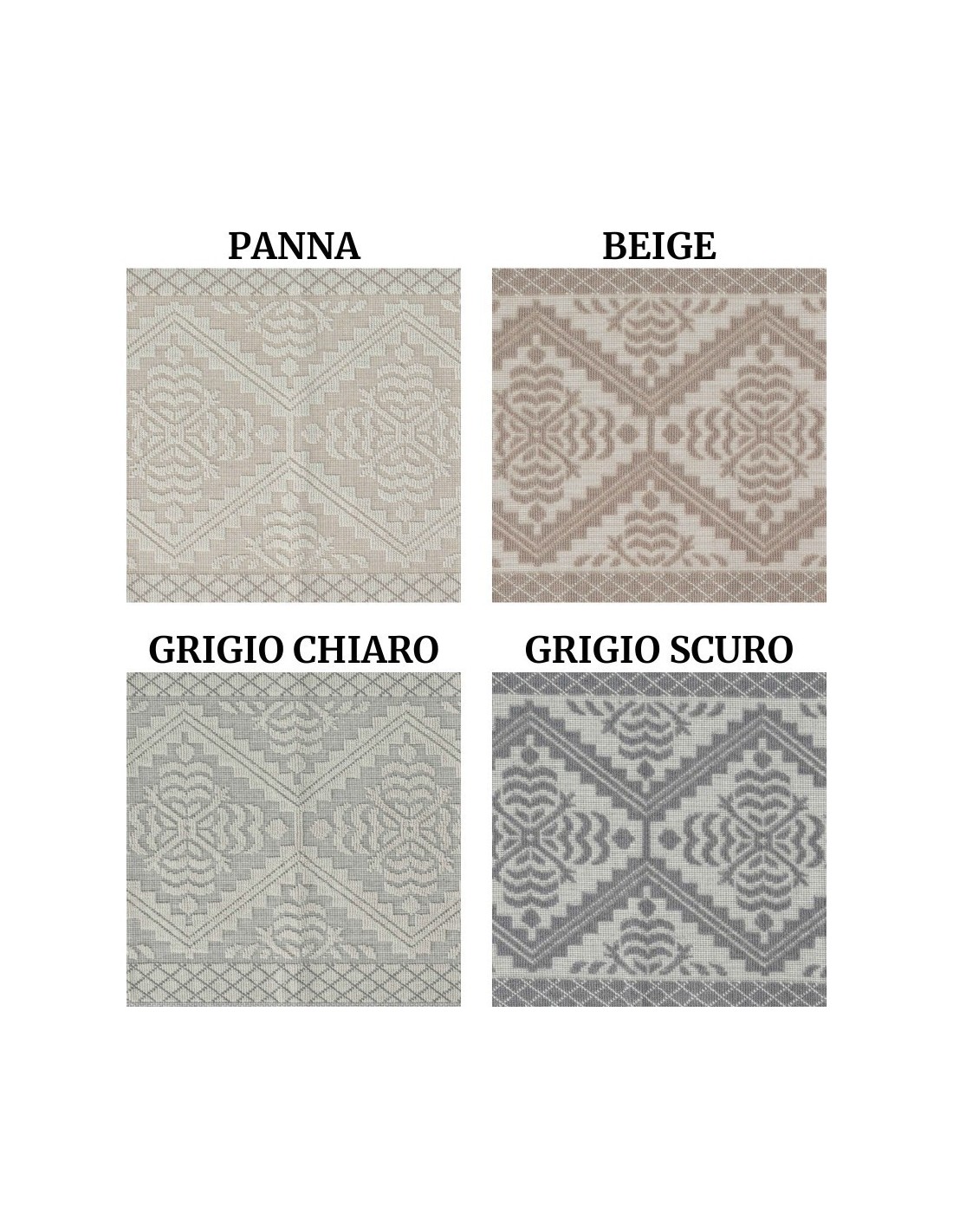 Una trama fitta e compatta fa da base a disegni in rilievo creati dalla classica lavorazione a ricciolino..