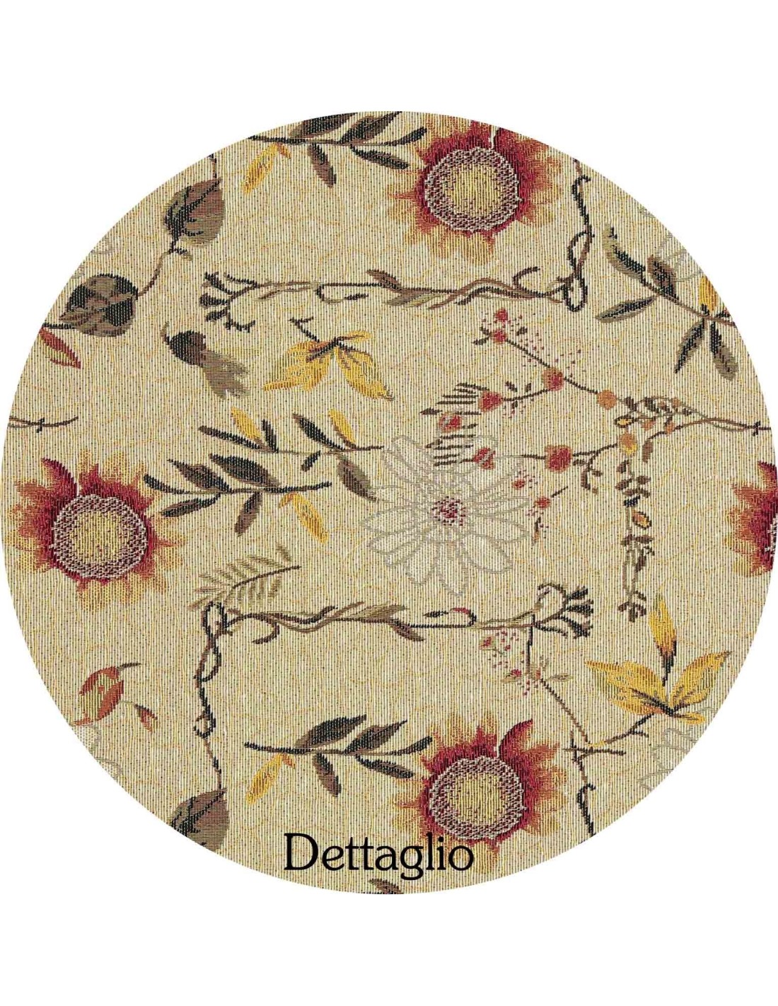 Una base naturale su cui sono adagiati girasoli e altri fiori tra rametti e foglie, non stampato ma creato con la lavorazione jacquard per una primavera eterna in casa tua..