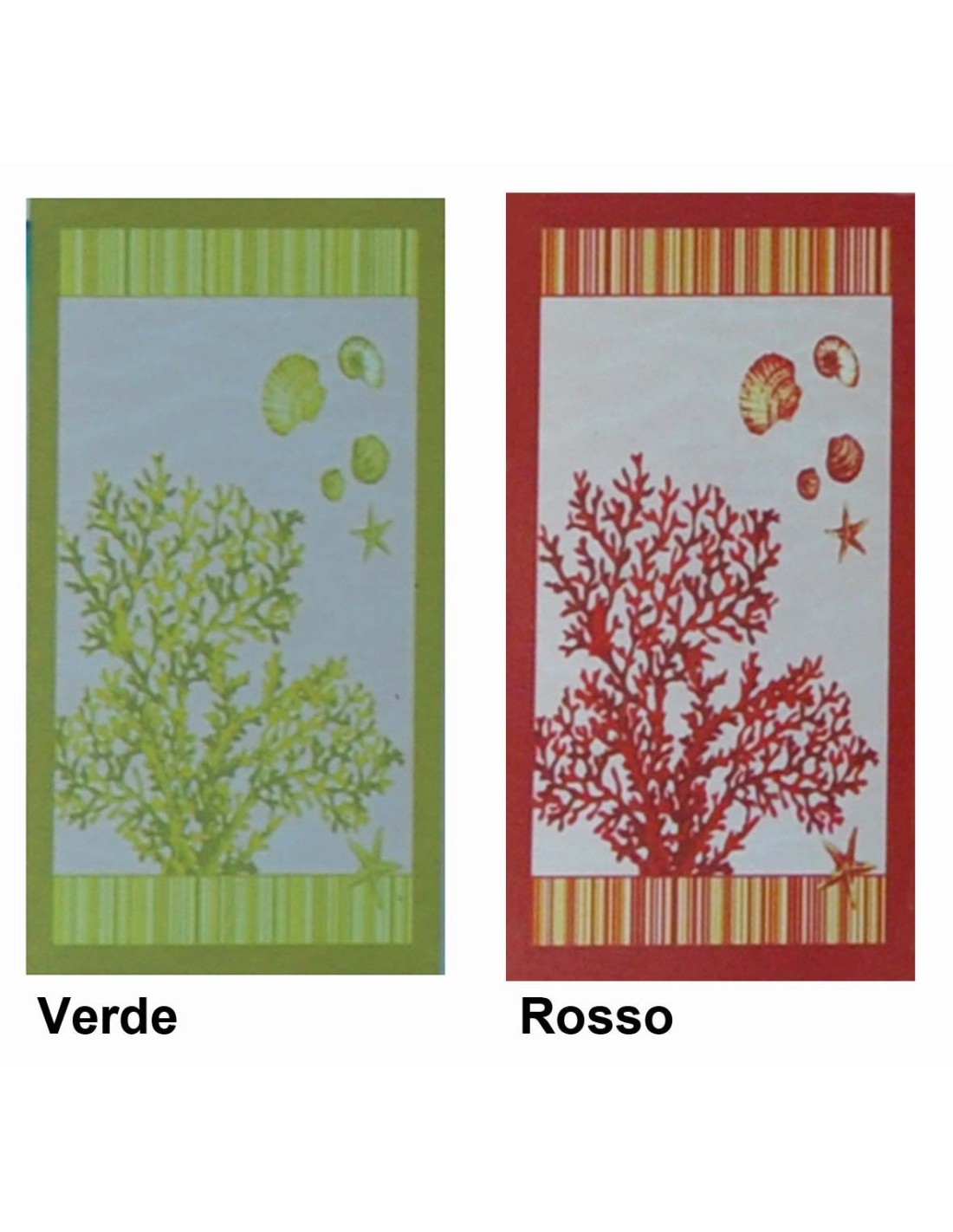Su un fondo beige screziato, un grazioso e colorato rametto di corallo, con conchiglie e stelle marine, abbellito da due fasce con righe colorate a testa e a piedi e per completare una banda tinta unita a corniciare questo splendido stralcio di mare..