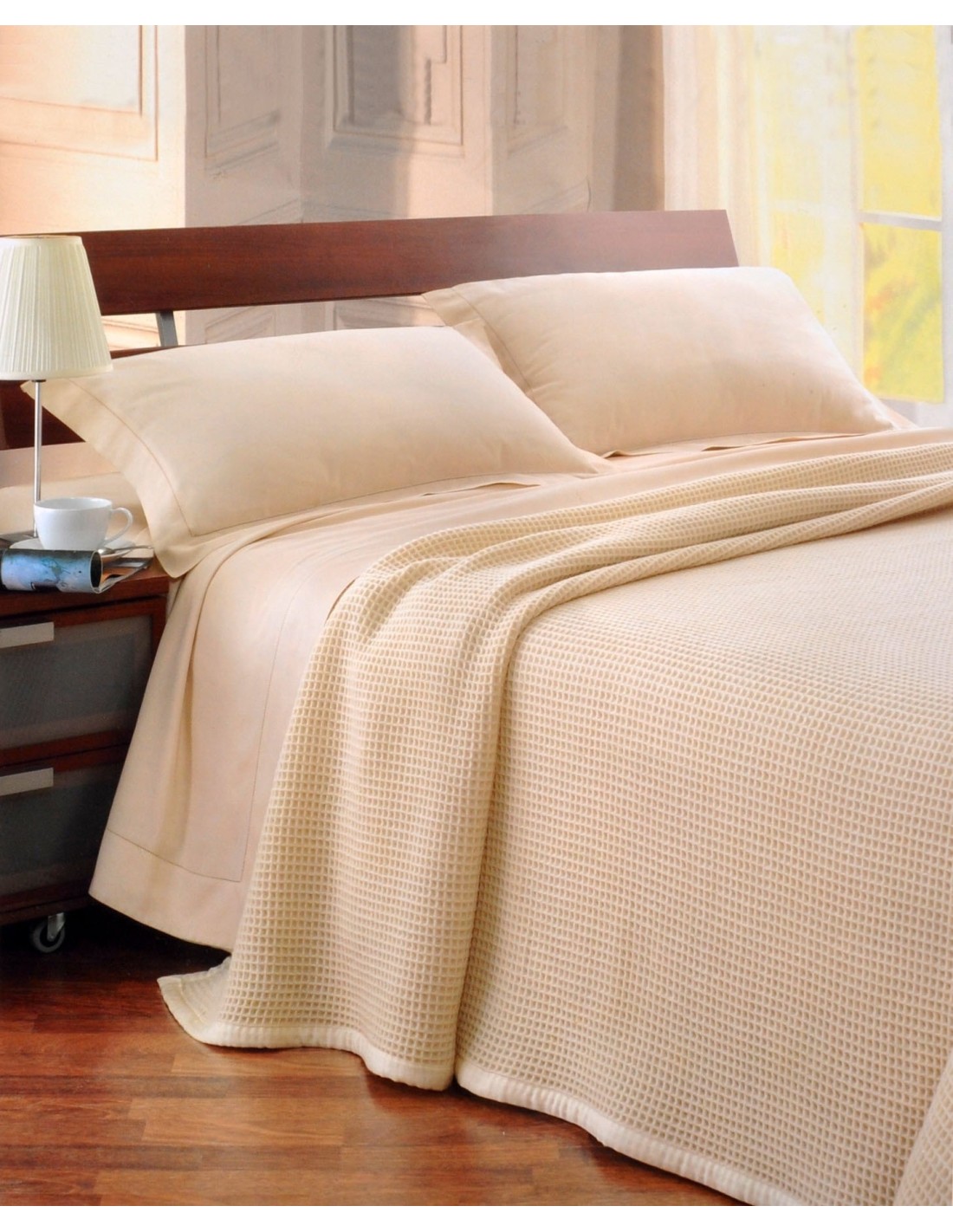 Particolare coperta tessuta a nido d'ape in un mix di lane pregiate Kashmir e Merinos.