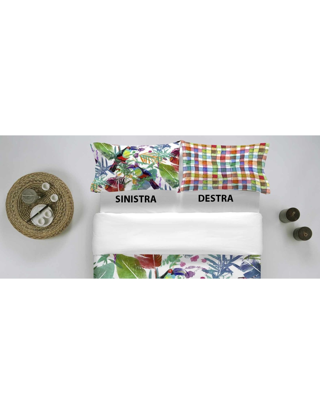 La stampa è presente su una faccia della federa e sul lato superiore del sacco, ovviamente riproporzionato in modo da essere a tutto campo su entrambi e su entrambe le misure del letto, il retro della federa e del sacco sono in tinta unita neutra. Le 2 federe sono stampate con 2 fantasie diverse, per questo motivo nel completo singolo, essendoci 1 sola federa, hai la possibilità di scegliere tra destra e sinistra come da foto in base al disegno che vuoi ricevere. Il matrimoniale è disponibile solo in combinazione unica..