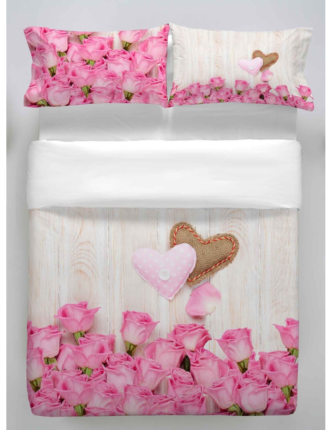 Su di un fondo in legno sbiancato una esplosione di rose dalle delicate sfumature e nel centro 2 grossi cuori in stoffa per un letto fantasticamente romantico..