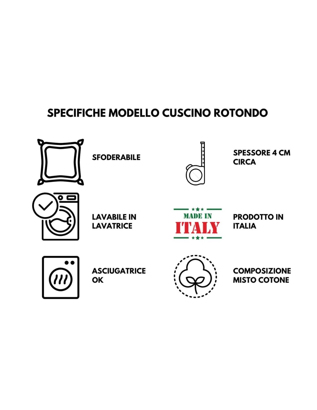 Dimensione cuscino diametro cm. 38 fornito di imbottitura alta 4 cm. e disponibile in più colori a scelta.