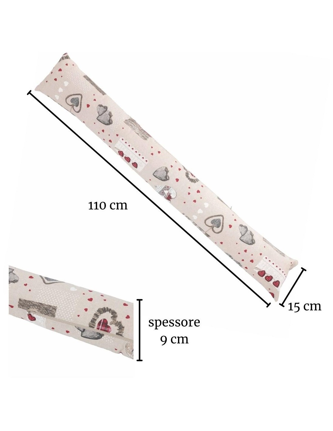 MISURE: Il cuscino parafreddo è lungo 110 cm, largo 15 cm. e ha uno spessore di circa 9 cm, un prodotto ideale sia per finestre che per porte..