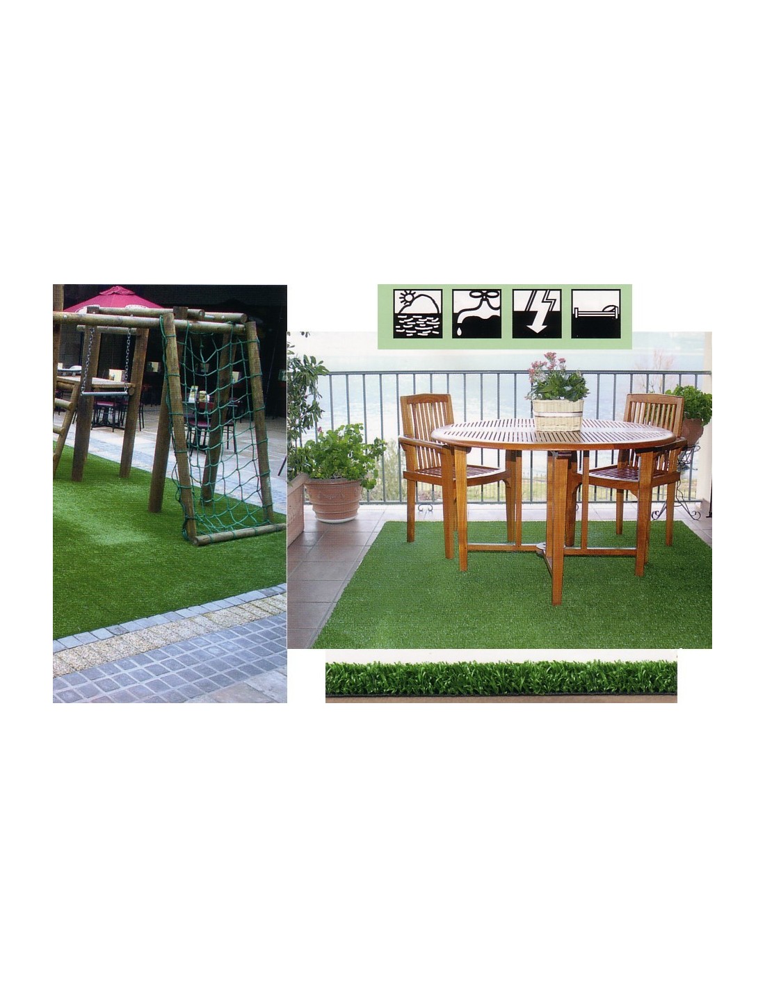 Ideale come tappeto erboso sottopiscina, per terrazze, per creare corsie sempre pulite o per avere spazi gioco per i bambini dove non doversi mai preoccupare di fango o erba alta, l'unico tuo problema sarà scegliere la lunghezza del rotolo che fa al caso tuo..