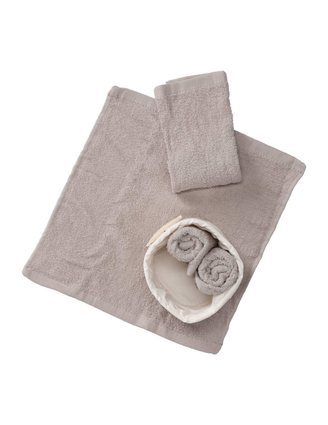 Un pratico e grazioso set di lavette che comprende 4 lavette dello stesso colore 30x30 cm. in spugna di cotone alloggiate in un cestino anch'esso in tessuto graziosamente adornato..