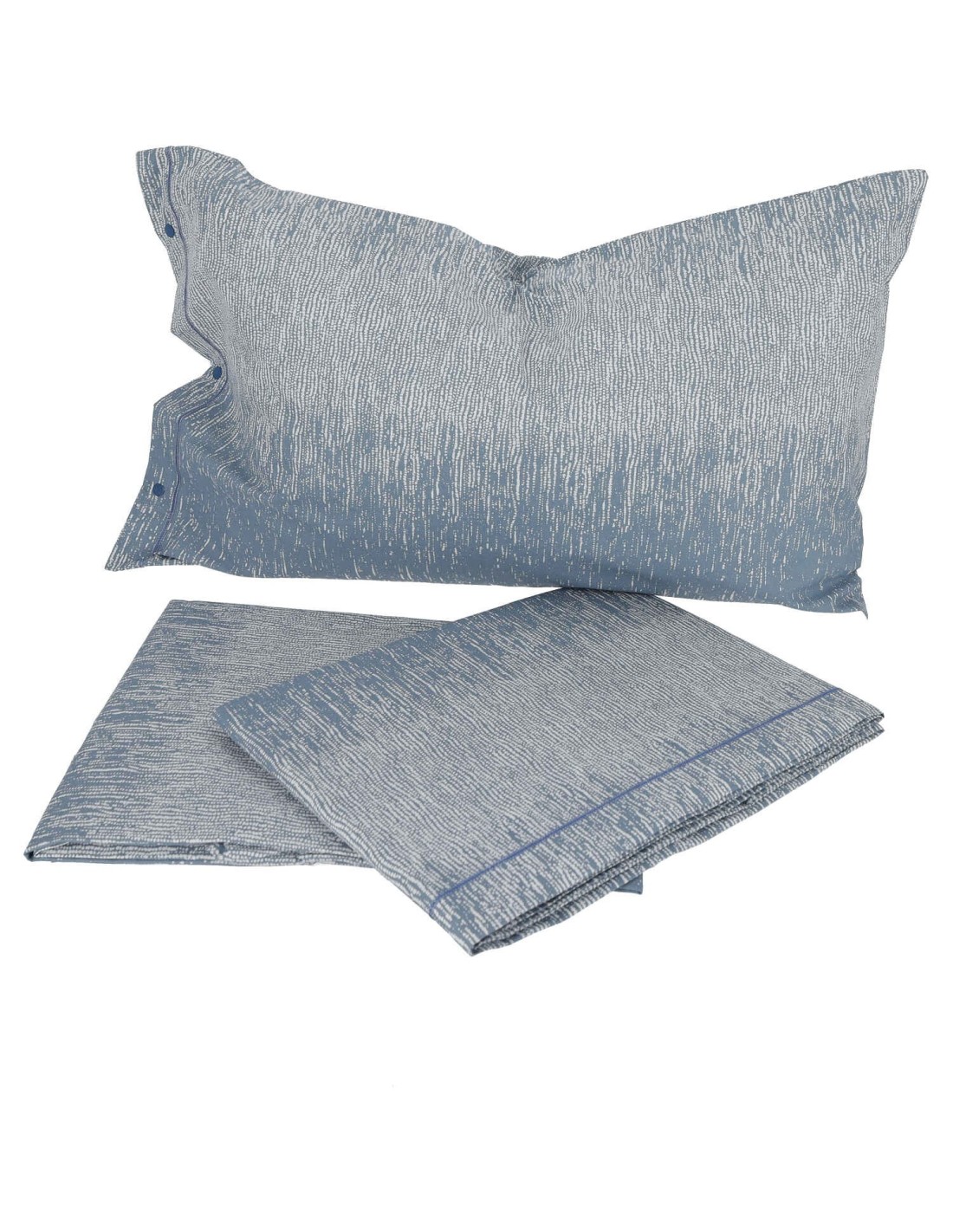 Un set di lenzuola in tinta unita con tantissimi puntini bianchi che uniti formano strische che si spargono per tutto il disegno che è stampato sul diritto di tutti i pezzi delle parure e su entrambi i lati della federa.