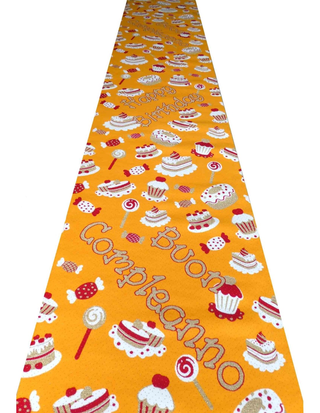 Un tappeto multiuso dalle misure generose ideale durante una festa, protegge e mantiene pulito, scegli tra 2 diverse larghezze, 1 metro o 2 metri e ogni unità poi corrisponderà a una lunghezza di 3,15 metri nell'altezza da te selezionata. In questo modo avrai il disegno completo con gli auguri in italiano e in inglese..