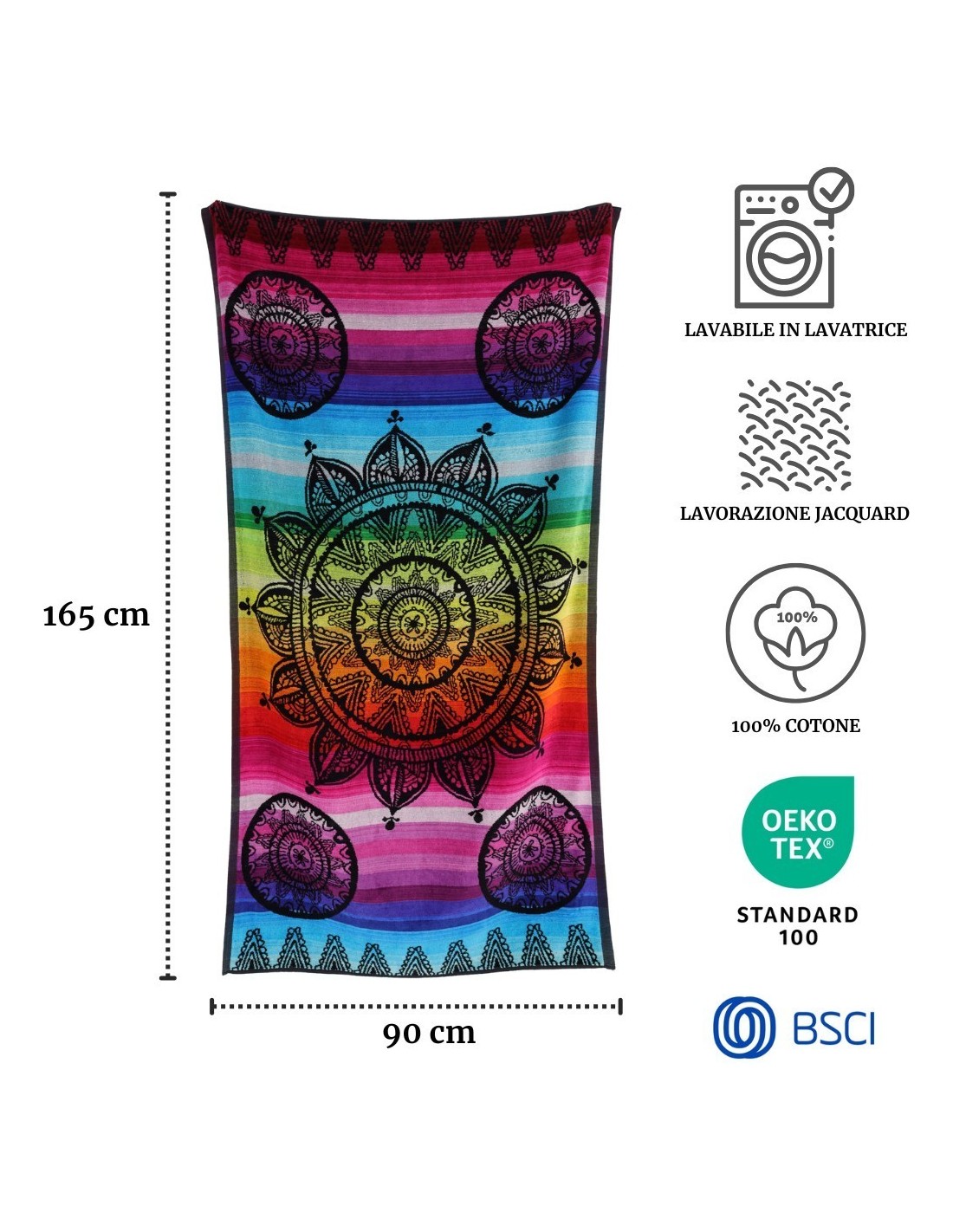 DEHLI: Telo mare spugna jacquard 90x165 cm. dai colori brillanti e vivaci che risaltano abbinati al nero a creare un mandala..
