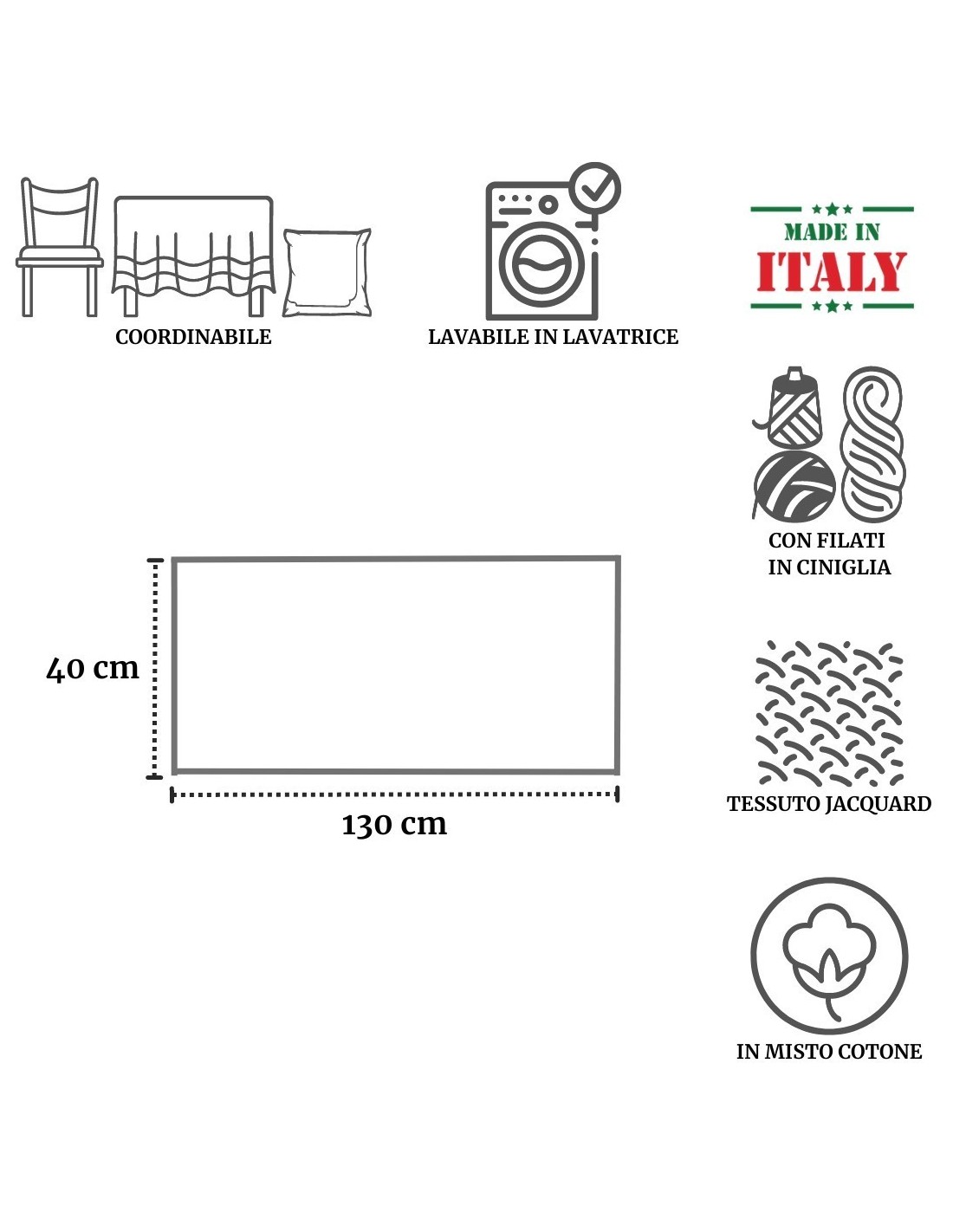 Il centrotavola misura 84x84 cm. mentre il runner è offerto nella misura corta 40x130 cm. e nella misura lunga 40x180 cm..