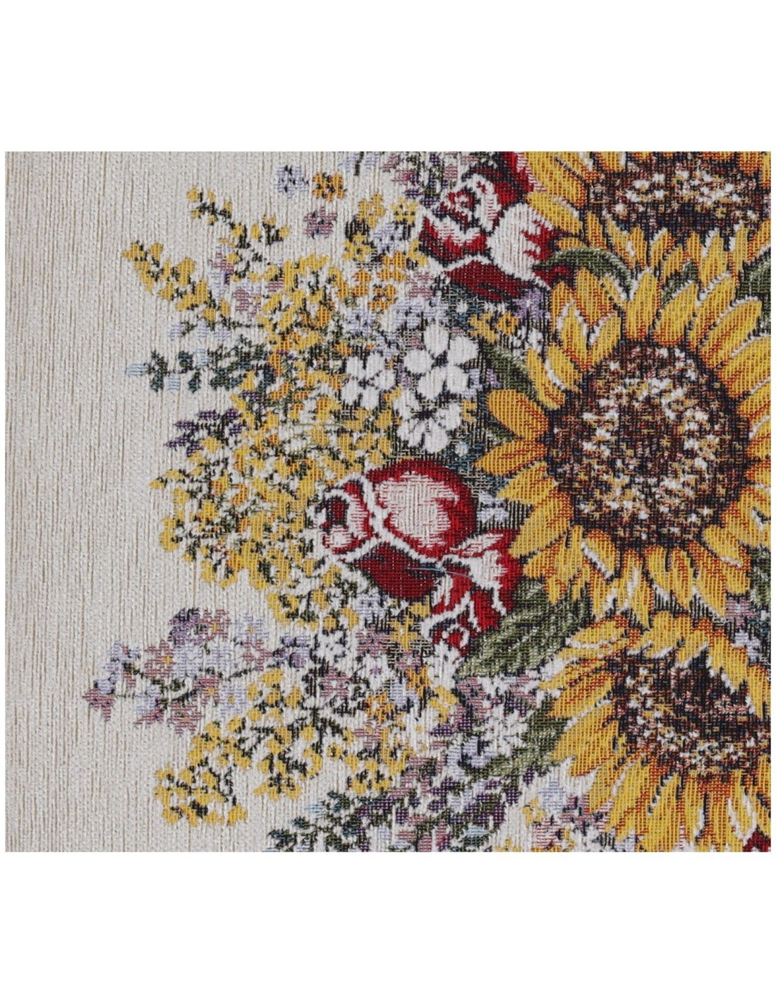 Il centrotavola misura 84x84 cm. mentre il runner è offerto nella misura corta 40x130 cm. e nella misura lunga 40x180 cm..