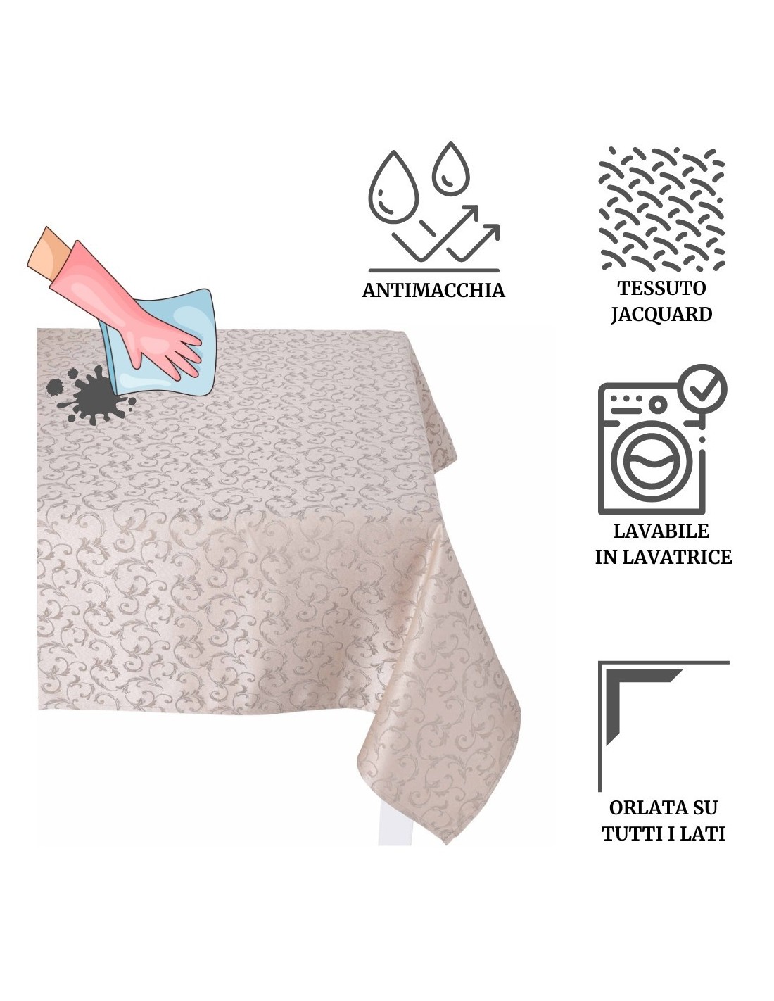 La tela con decoro damascato non è stampata ma è creata con la lavorazione jacquard direttamente in tessitura e l'utilizzo di filato sintetico dona una graziosa lucentezza alla tovaglia..