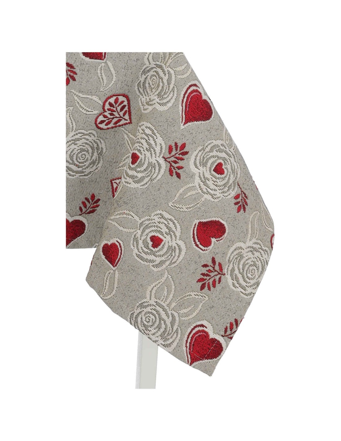 Su di uno sfondo in tinta unita con leggere sfumature risaltano dolci cuori rossi ed eleganti rose bianche a caratterizzare appieno lo stile romantico di questa tovaglia..