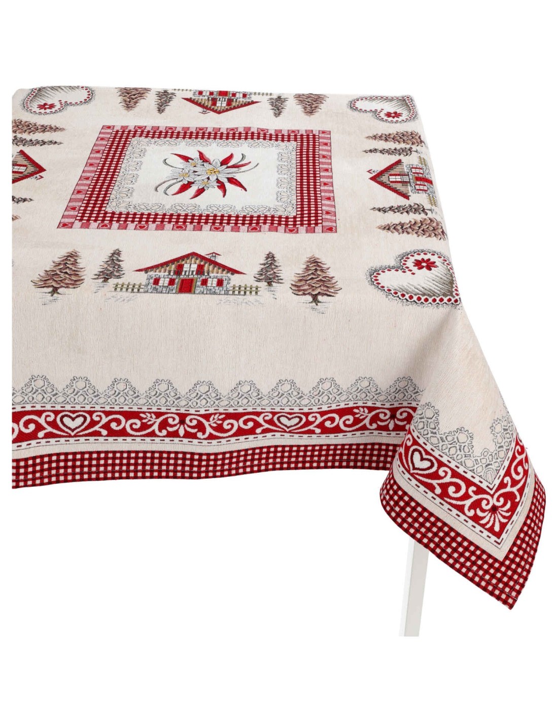 Una tovaglia piazzata in pieno stile tirolese, ideale per le case di montagna, con scacchi bianchi e rossi abbelliti da cuoricini, casette e fiori..