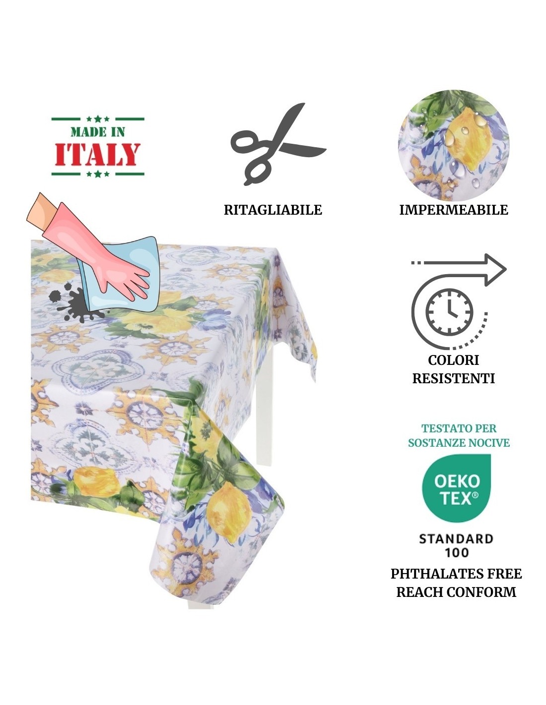 CARATTERISTICHE: Tovaglia prodotta interamente in Italia composta da una foglia di vinile stampata e accoppiata con tessuto non tessuto. Venduta senza rifinizione non sfila, taglio a vivo in molte misure standard e anche al metro per una tovaglia su misura o per le tavolate più numerose..