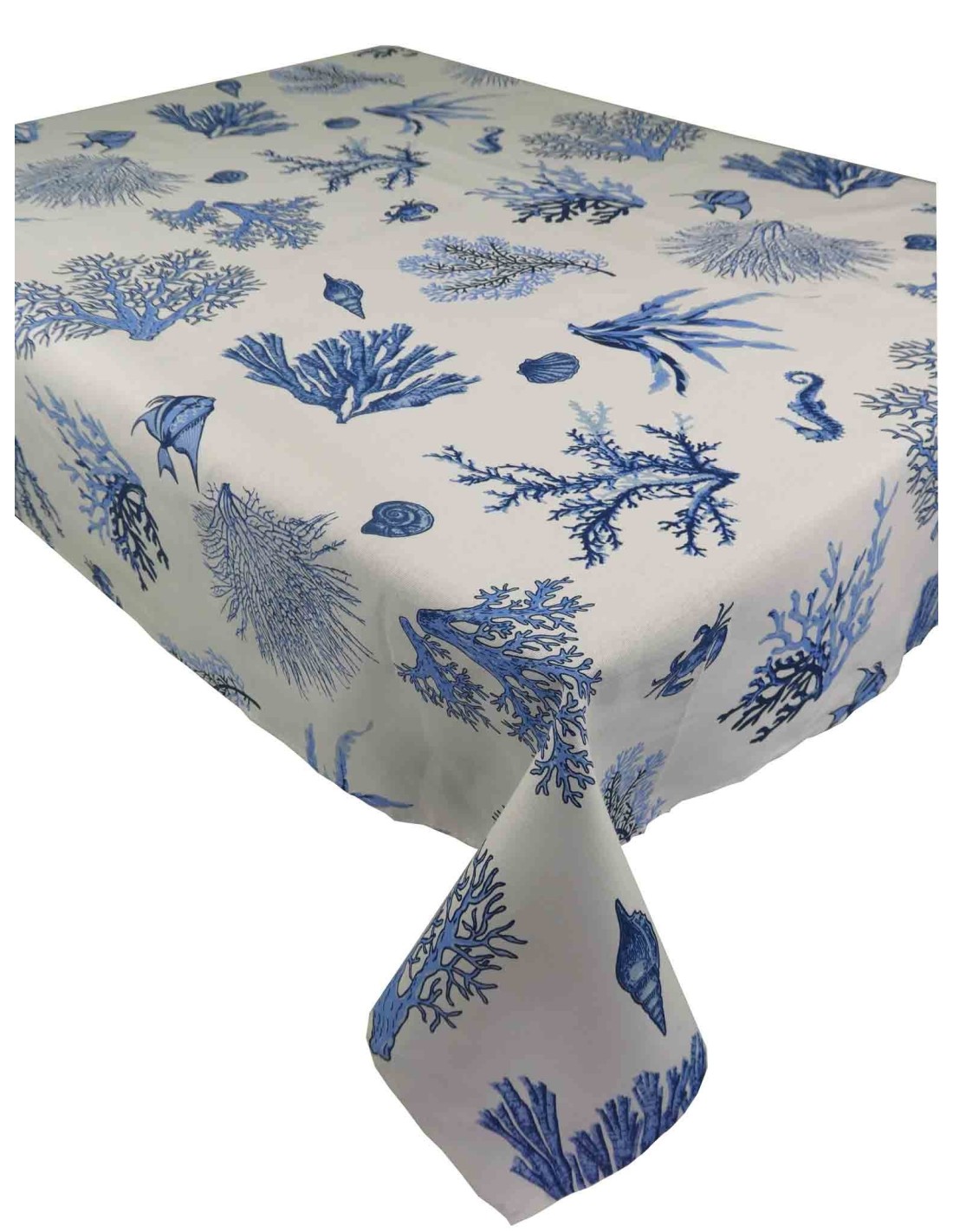 Una fantasia marina fresca e spensierata stampata su di una tela di cotone dalla mano consistente e dalla colorazione bianca su cui spiccano conchiglie, alghe e coralli, offerta in più varianti per vestire la tua tavola in base ai tuoi gusti..