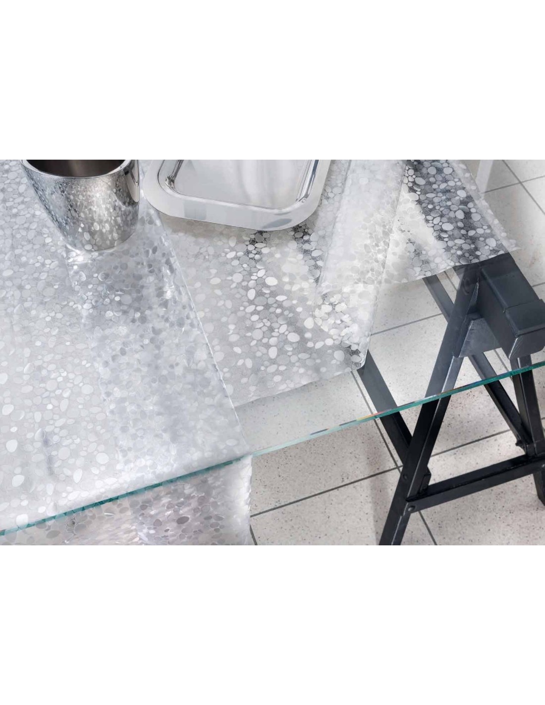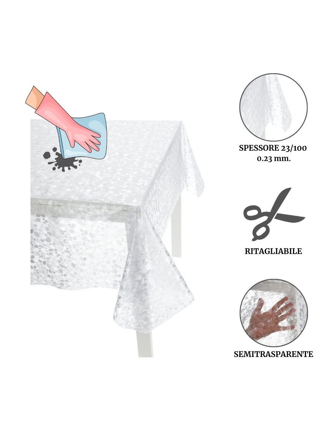 CARATTERISTICHE: Altezza 137 cm. Composta da una foglia di vinile trasparente dalla mano goffrata con spessore 0.23 mm. Venduta senza rifinizione non sfila, taglio a vivo in molte misure standard e anche al metro per una tovaglia su misura o per le tavolate più numerose..